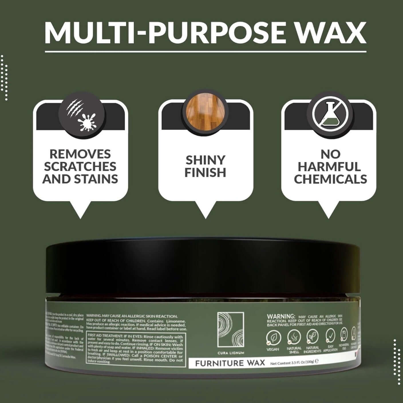 BRILLANT LONGUE DURÉE : contrairement à la cire d'abeille ordinaire pour bois dur, notre cire pour meubles pénètre profondément dans le bois tout en le nourrissant et hydratant. Elle restaure et protège également le bois des taches et de la poussière, et lui confère une finition brillante de longue durée.