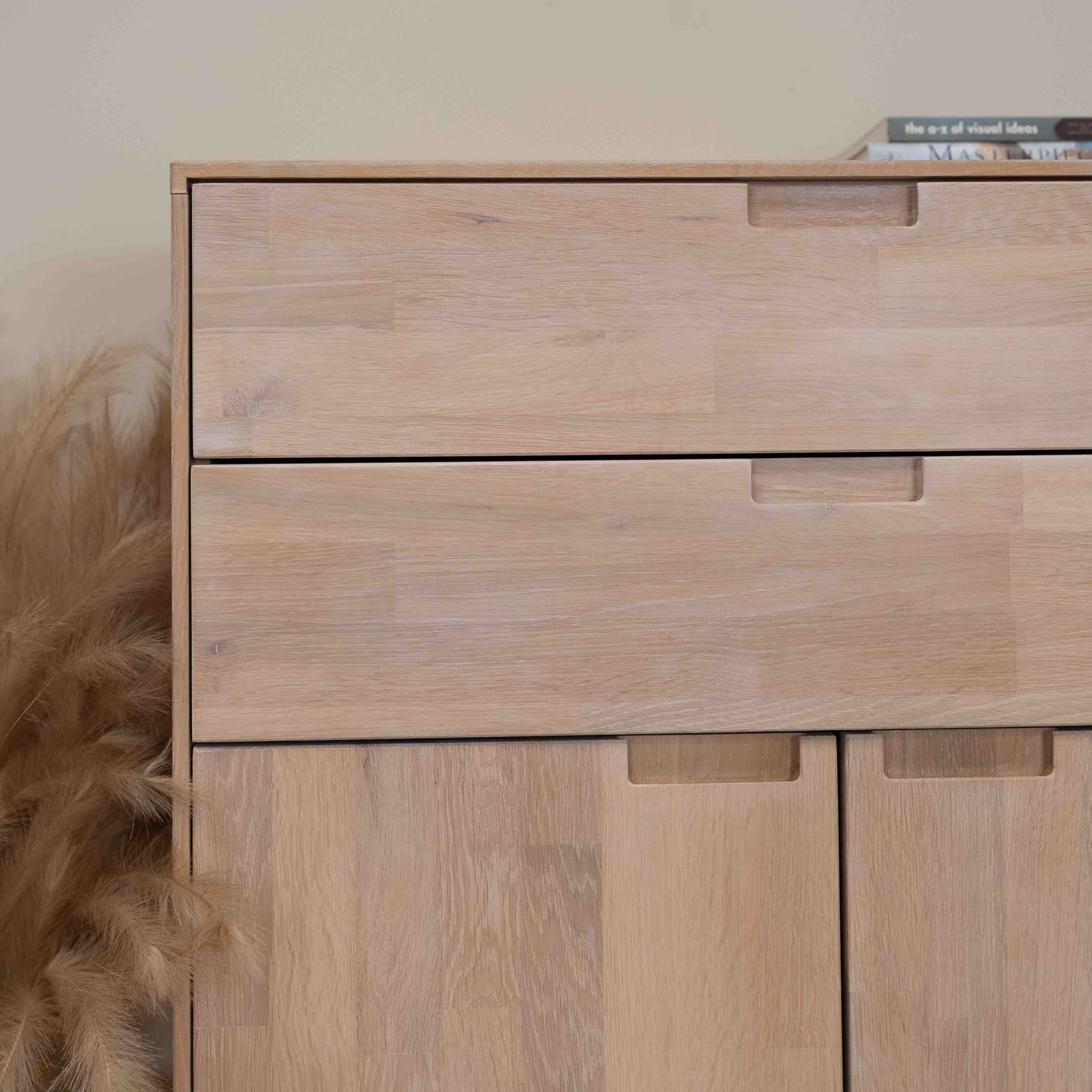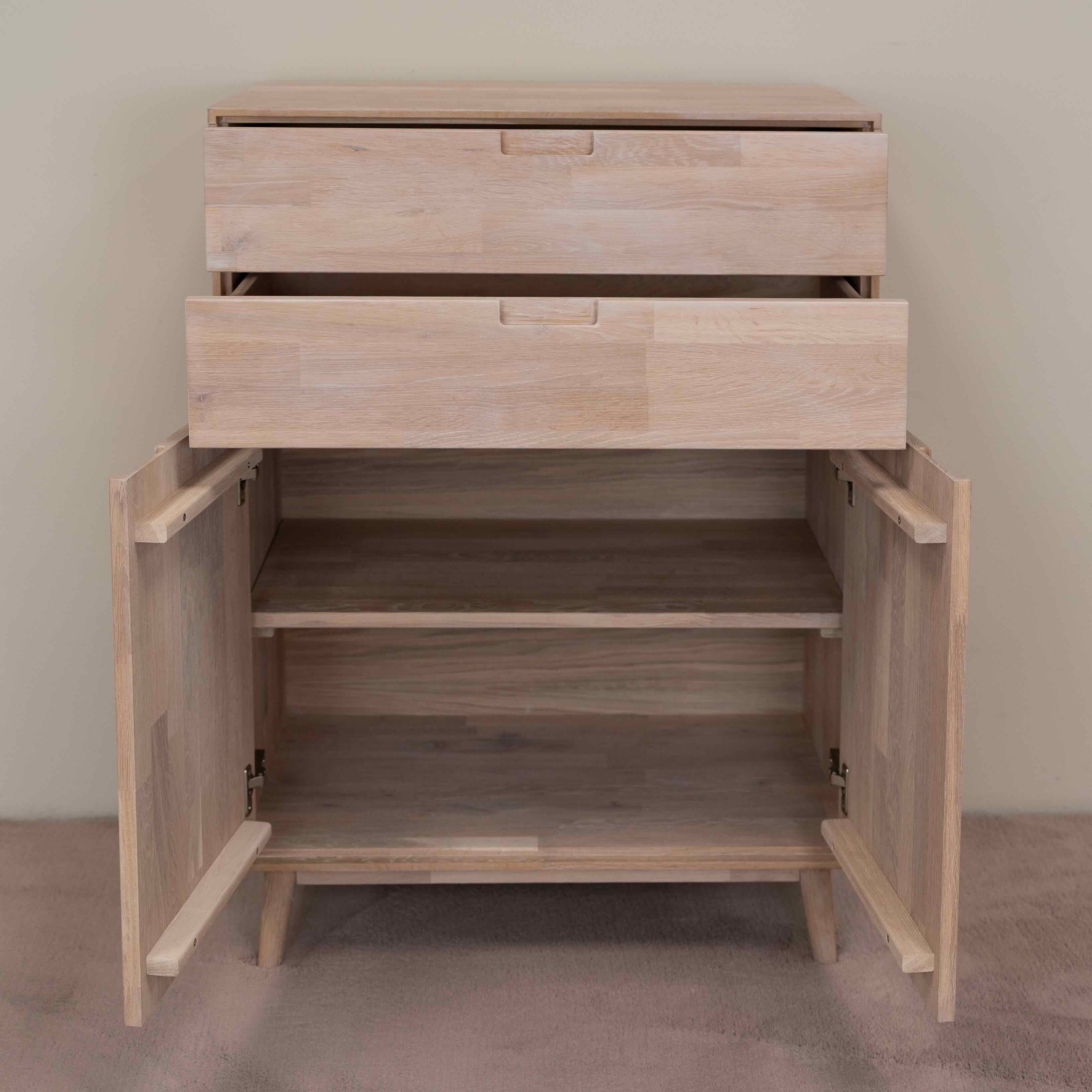 Cette commode en chêne massif Escandi 2 fait partie des meubles qui ne passent pas inaperçus. Robuste et élégante, elle vous offre une belle capacité de rangement – deux tiroirs spacieux et deux étagères fermées à porte - afin de bien organiser tous les indispensables de votre vie quotidienne. Grâce à son design original et à la texture de son bois, cette commode apportera un vrai caractère à votre intérieur.