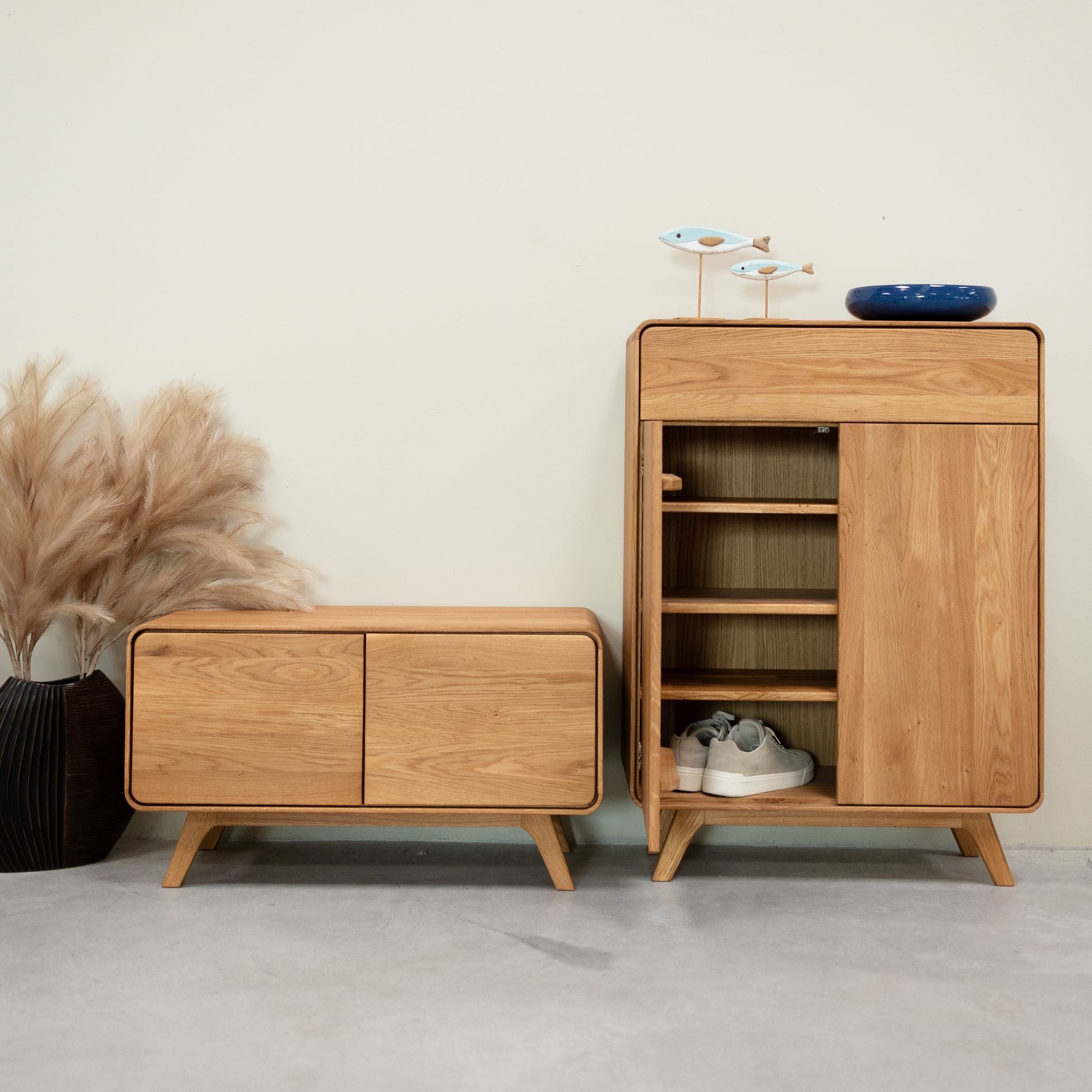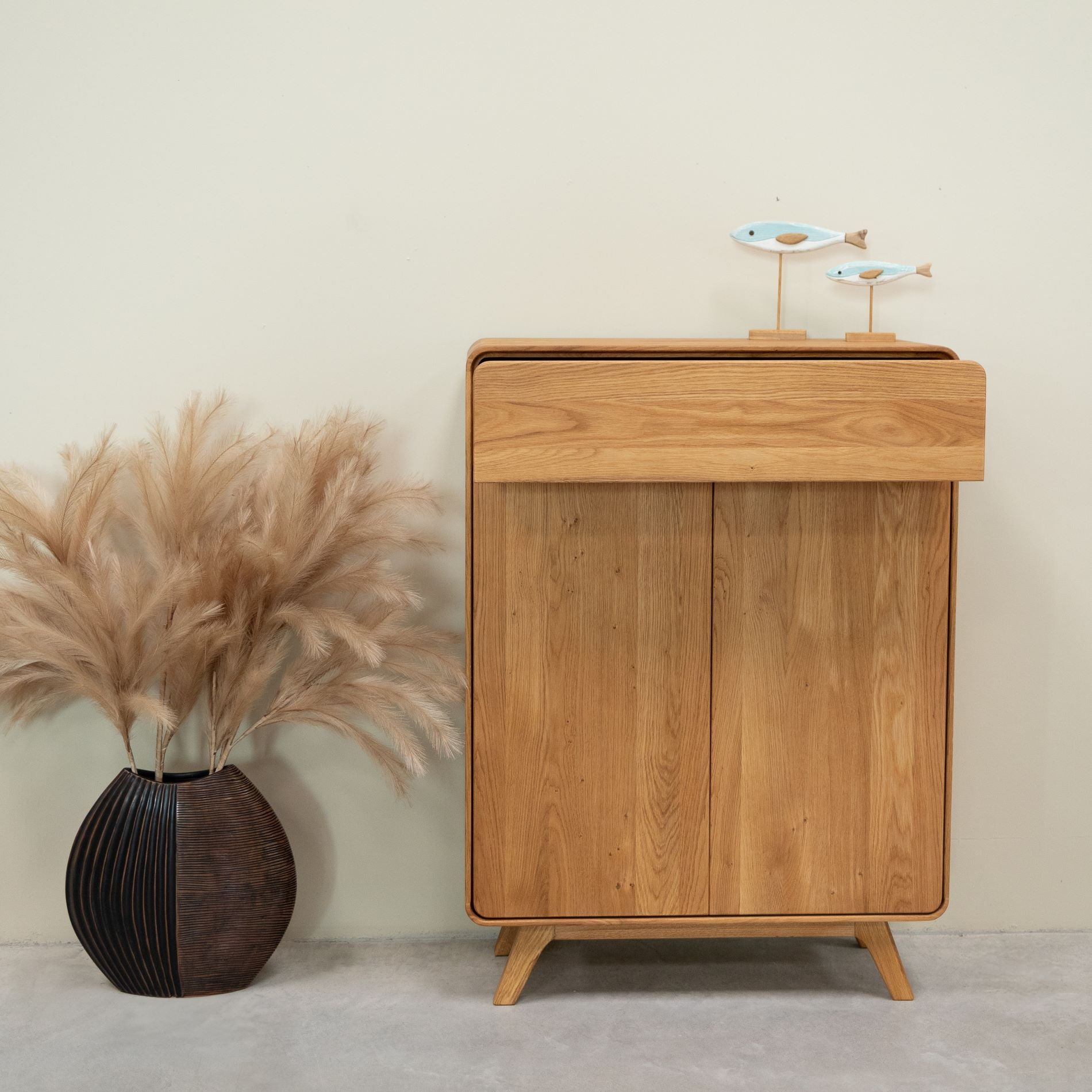 Le meuble à chaussures Genève est fabriqué en bois massif de chêne durable, garantissant une qualité exceptionnelle tout en respectant l'environnement. Avec ses dimensions de 80 x 35 x 110 cm, il est parfait pour organiser vos chaussures tout en apportant fonctionnalité et élégance à votre intérieur. Sa finition naturelle à l'huile met en valeur la beauté authentique du chêne, offrant un design chaleureux et raffiné qui s'intègre harmonieusement aux styles nordiques et contemporains.