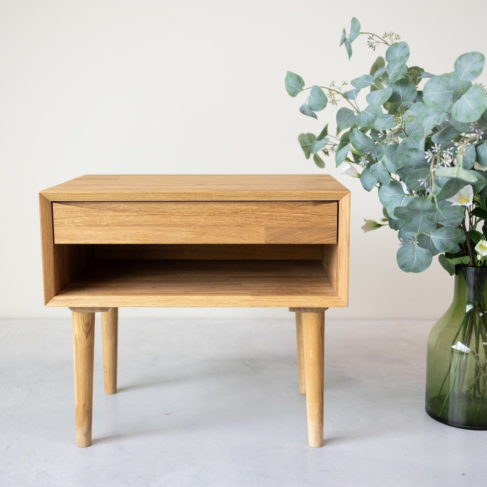 Entre vintage et contemporain, la table de nuit en chêne massif Escandi 2 habillera avec élégance votre espace de détente. Dotée d’un tiroir et d’une niche ouverte, elle accueillera vos livres et autres petits objets personnels. Simple et naturelle, elle ajoutera une touche scandinave à votre intérieur.