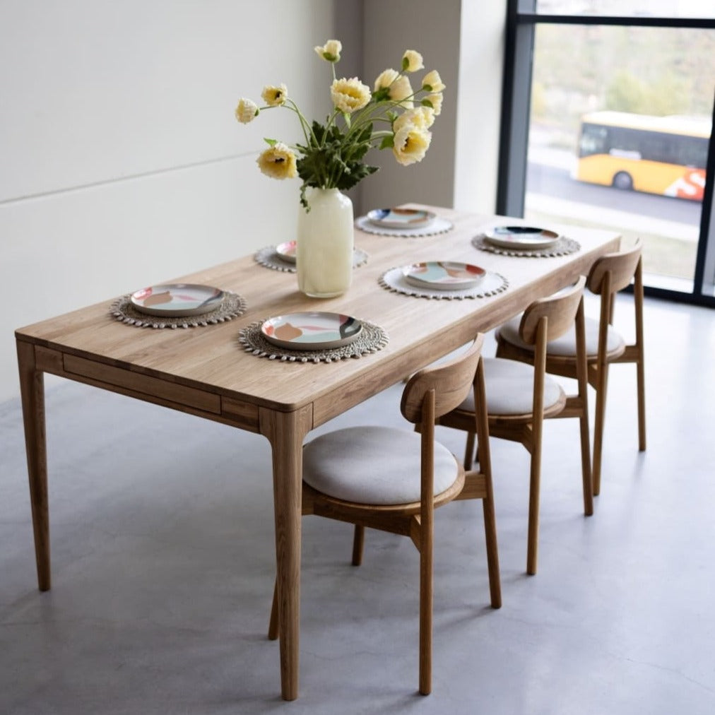 Inspirée du design scandinave, la table à manger en chêne massif Bergamo vous séduira par son élégance et son originalité. Ses coins arrondis ajoutent une touche de douceur et de sécurité, particulièrement appréciée dans les foyers avec des enfants. Très astucieuse, cette table dispose également de deux tiroirs latéraux ainsi que de rallonges de 47 cm de chaque côté. Dans les versions de 140 cm et de 160 cm, l’une des rallonges se range en dessous du plateau et l’autre séparément. Le modèle 200 cm permet de ranger les deux rallonges sous le plateau. Cette table est idéale pour les repas en famille ou entre amis, tout en combinant la fonctionnalité et l’esthétique intemporelle.