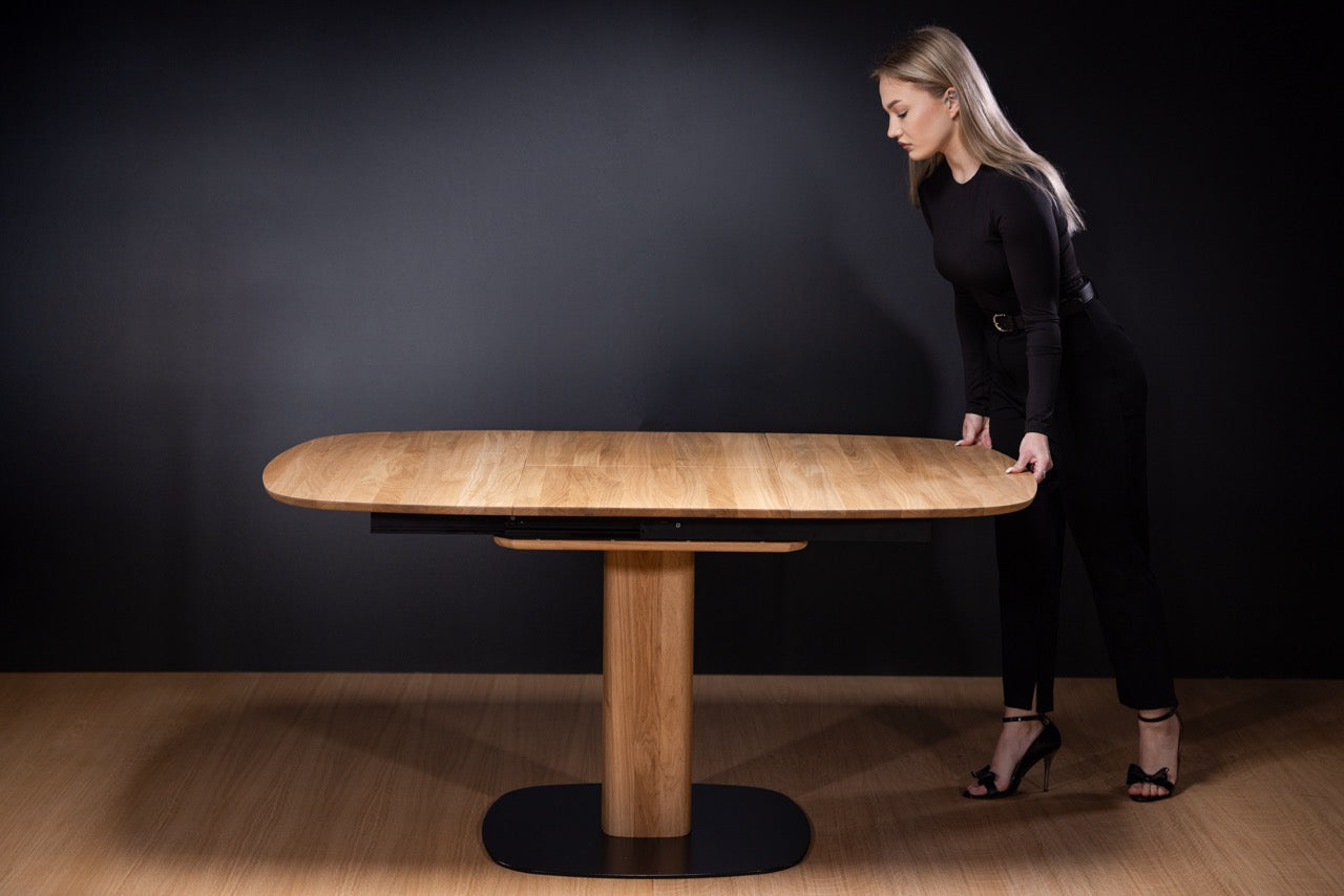 Conçue à partir de matériaux de haute qualité, la table Luna de Karpis au piètement central allie élégance et fonctionnalité, même dans les espaces plus compacts. Son plateau extensible intègre un mécanisme discret qui permet d’agrandir facilement la surface grâce à une rallonge parfaitement intégrée. Luna est née d’une alliance harmonieuse entre l’acier noir et le bois chaleureux, sublimée par des formes superelliptiques résolument modernes. La solution idéale pour les intérieurs contemporains.