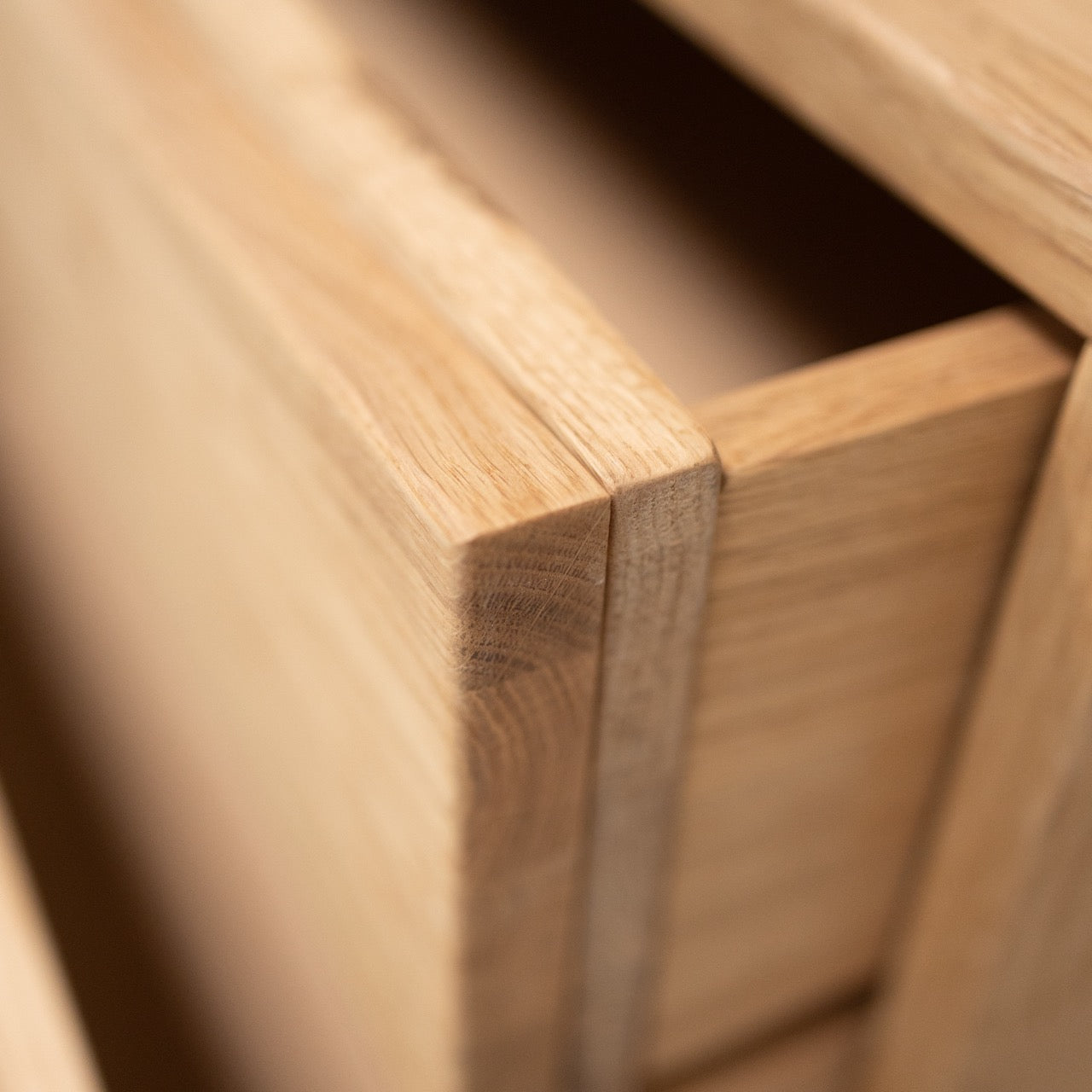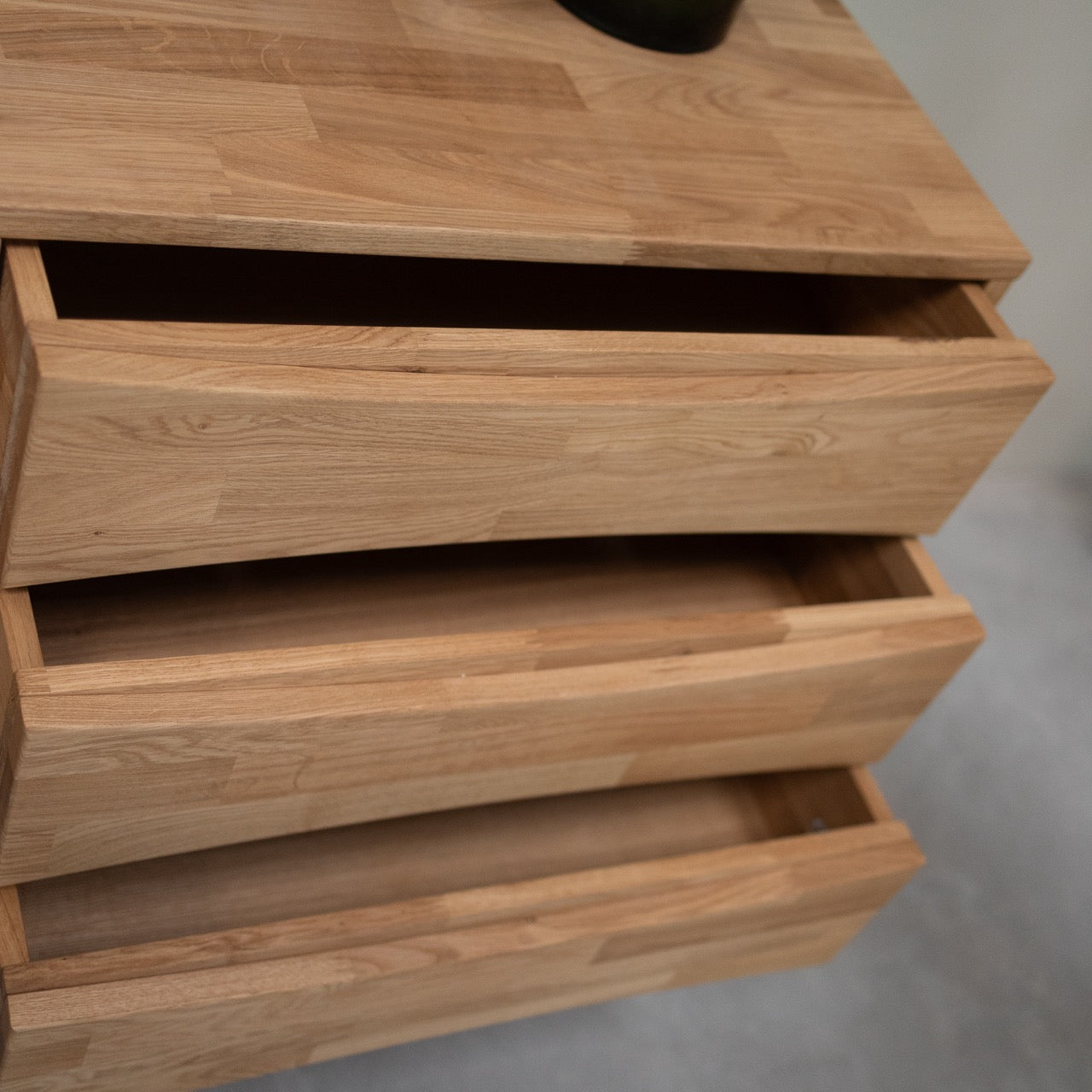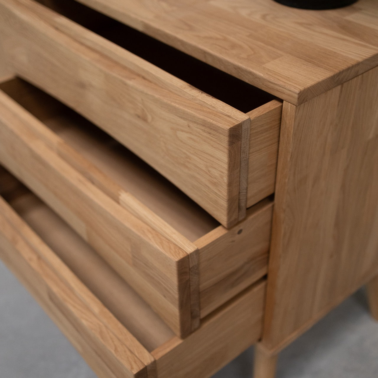 Le buffet commode en bois massif de chêne Malmo 1 de style scandinave est une pièce maîtresse alliant élégance et praticité. Doté de 3 tiroirs spacieux et d’un rangement à porte, ce meuble offre un espace de rangement optimal tout en conservant une allure épurée et moderne. Le chêne massif de couleur miel est mis en valeur par un design simple mettant en avant la beauté naturelle du bois.
