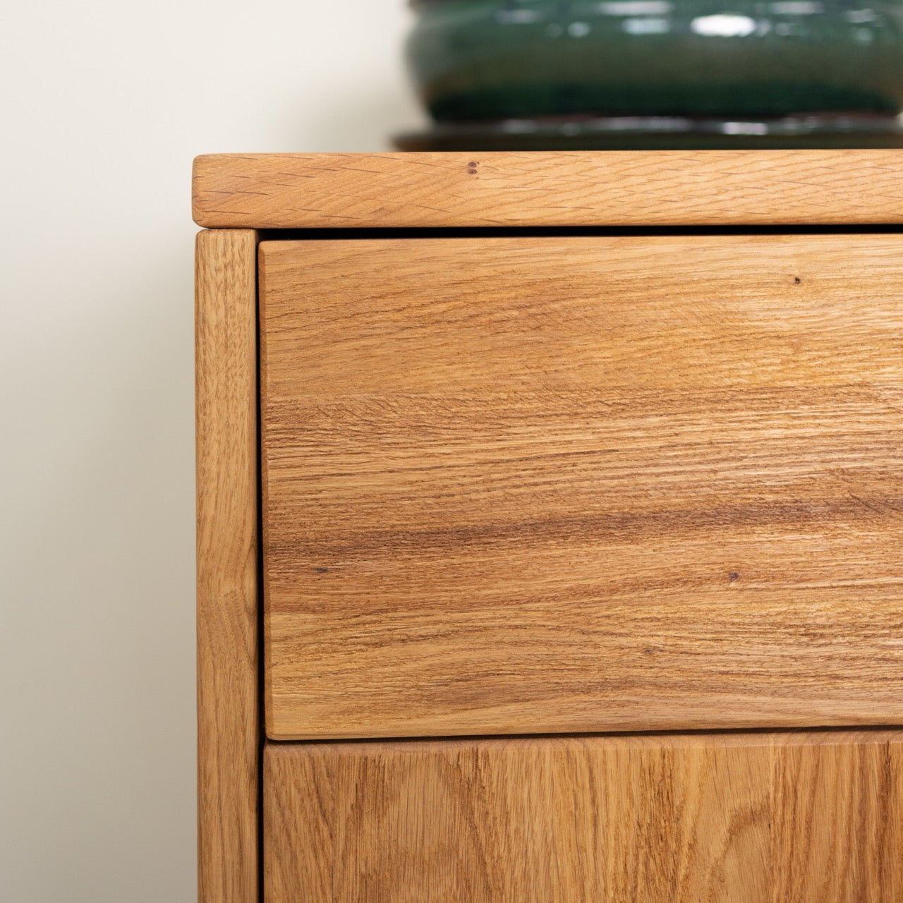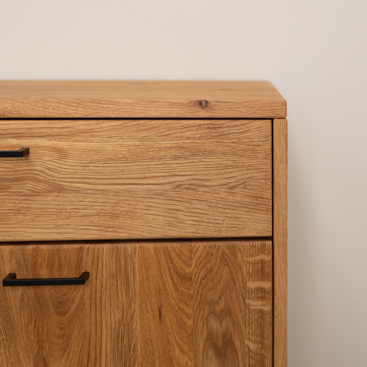 Matière : corps et façade en bois massif de chêne ou de noyer ; planche derrière en MDF plaqué ; pieds en métal noir.