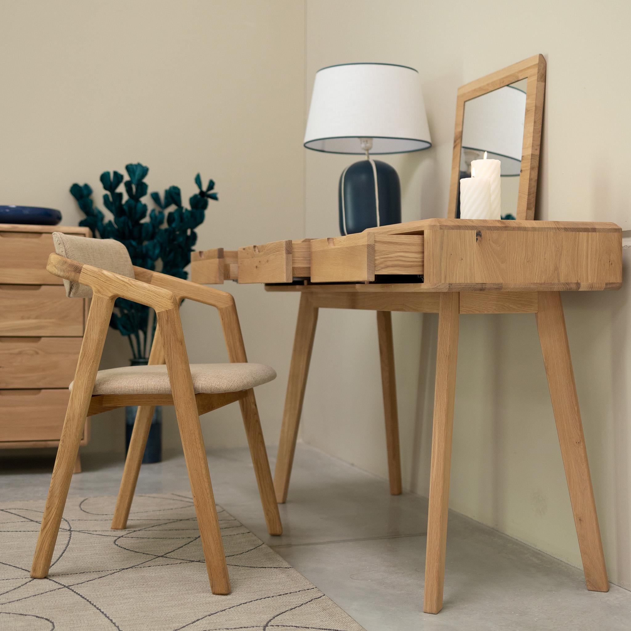 Avec ses lignes épurées et son design minimaliste, la coiffeuse Suède 1 en bois massif de chêne ou de noyer incarne la simplicité élégante et la praticité du style scandinave. A la fois fonctionnel et esthétique, ce meuble vous offre une grande capacité de rangement pour organiser vos produits de beauté, vos accessoires et autres petits objets de la vie quotidienne. Son miroir rabattable en fait un meuble très polyvalent pour toutes les occasions !