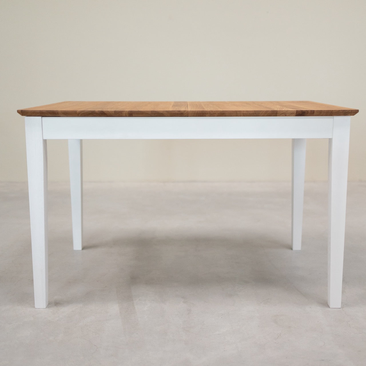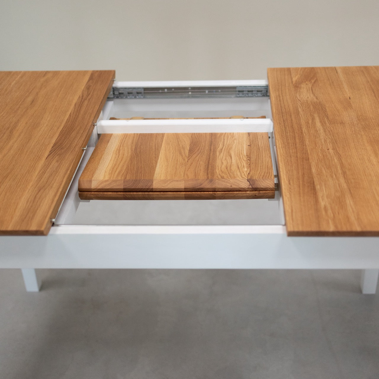 Cette table à manger extensible Lausanne allie la chaleur naturelle du bois et un design moderne épuré. Le plateau, en bois de chêne, est soigneusement travaillé pour révéler les veines subtiles et les nuances uniques de ce bois, apportant une touche de luminosité à la pièce. Les pieds blancs, en cendre massif, contrastent harmonieusement avec le plateau en chêne. Cette table incarne l'alliance parfaite entre esthétisme et fonctionnalité, s'intégrant aussi bien dans un intérieur contemporain que plus traditionnel. Elle est disponible en deux tailles.